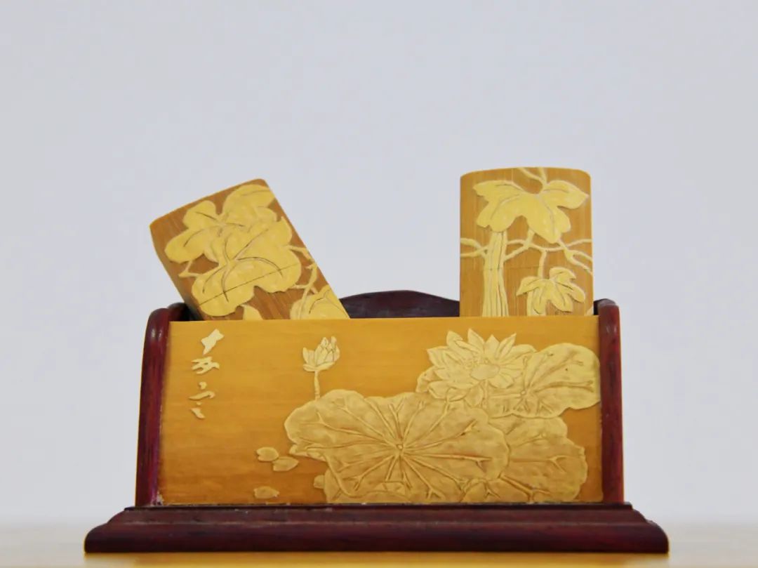 作品说明:作品创作灵感来自嘉定远香湖里成片的荷花,运用留青雕刻的技艺在名片盒上作画,深浅不同的雕刻让荷花灵动地呈现,以荷花喻廉洁。