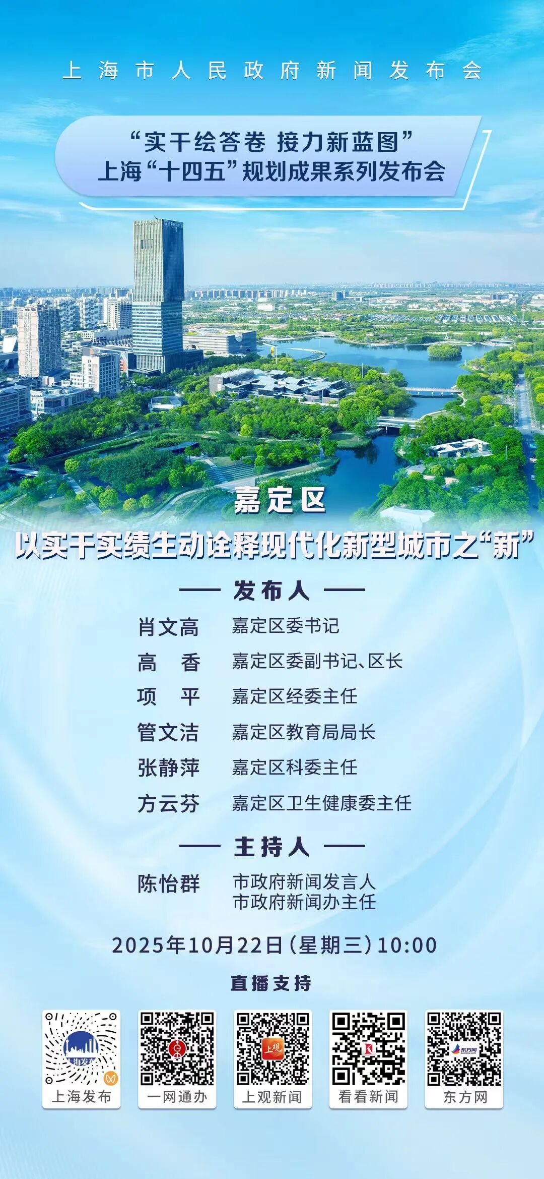 嘉定区委书记肖文高,区委副书记、区长高香,以及相关部门负责人将出席,介绍嘉定区“十四五”期间建设发展成果和下一步考虑等情况,并回答记者提问。