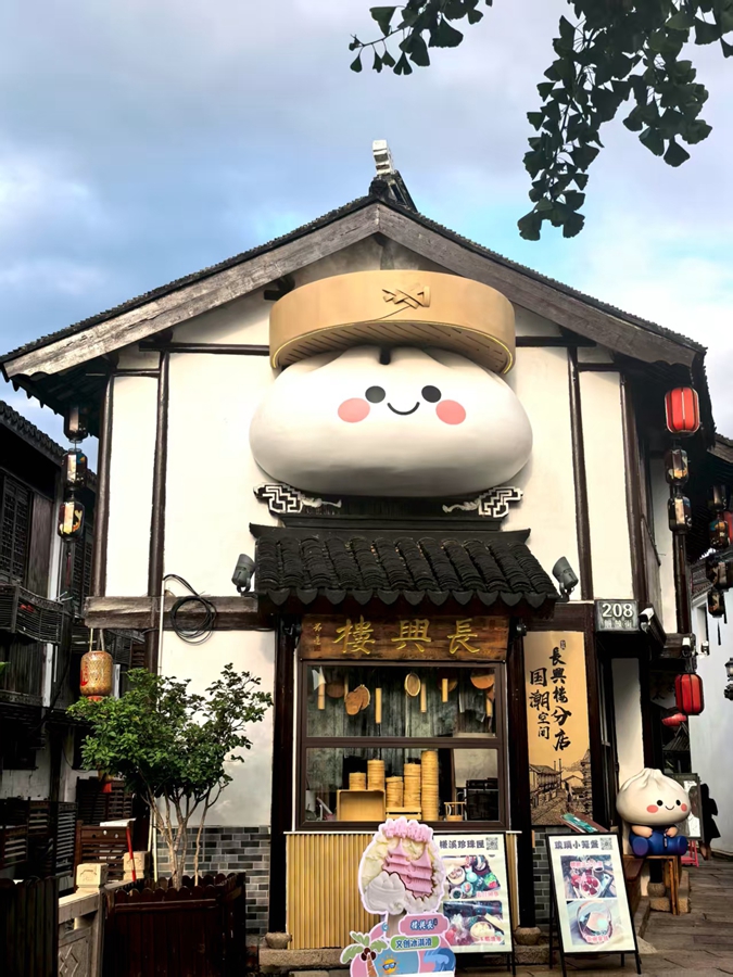 走在老街的主入口,古色古香的江南传统建筑外墙上“趴”着一只硕大的动漫小笼包艺术装置,还时不时地喷着蒸汽,原创IP人偶“包小龙”和“包小花”更是吸引了不少年轻人拍照“打卡”。