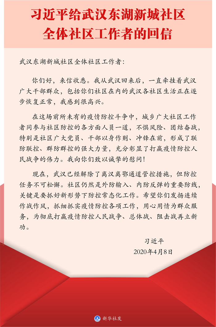 2020年,武汉市东湖新城社区的全体社区工作者给习近平总书记写信,表达了对习近平总书记和党中央的感激之情,以及继续坚守好阵地、履行好职责的坚强决心。
